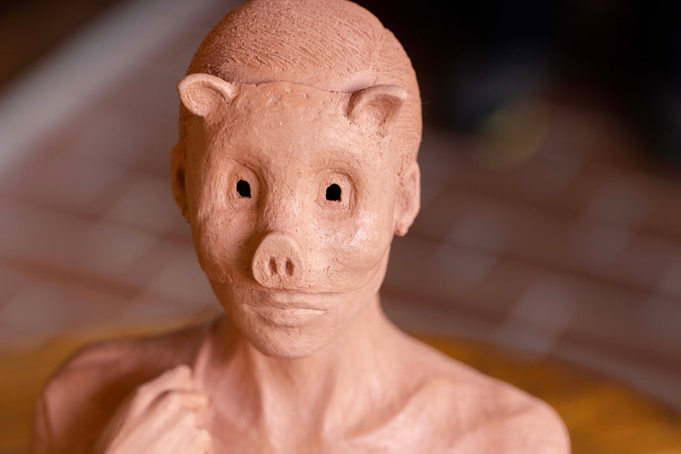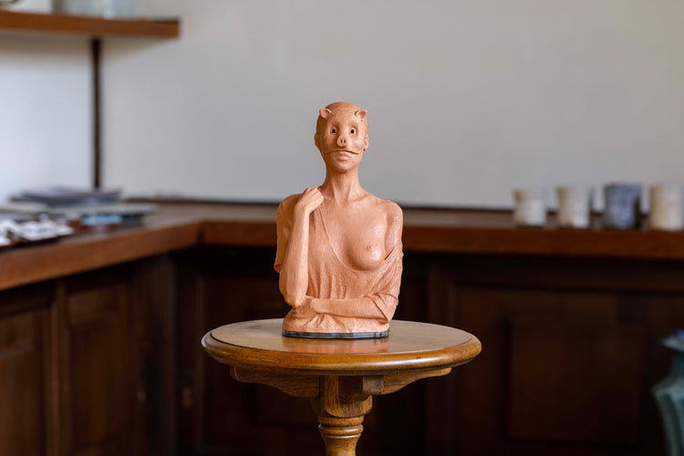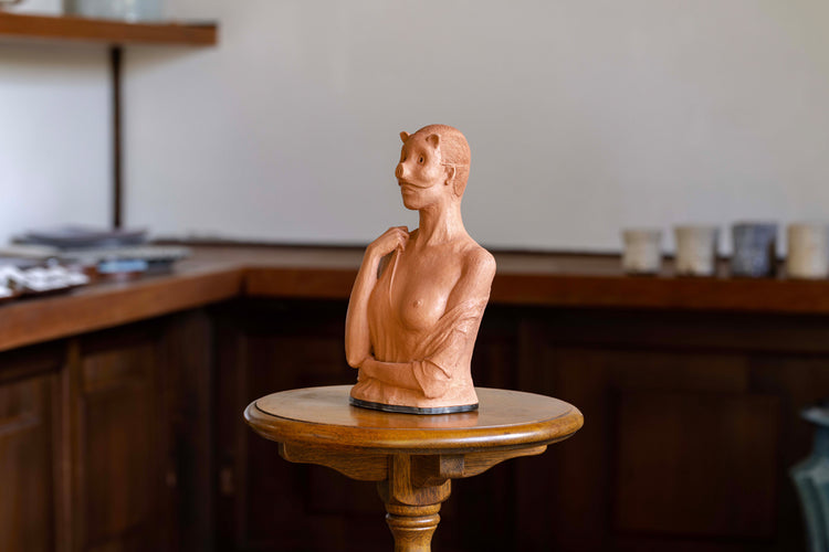 This sculpture exemplifies Toshiharu Watanabe's skills as both a potter, and as a contemporary artist. This is the male counterpart to the male, "Terracotta Pig Mask A."