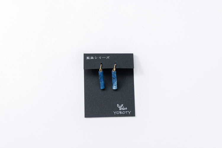 These lightweight earrings are made of indigo-dyed washi. No two pairs are the same, as the indigo dye creates different gradations when absorbed into the rolled-up washi. You can also spray these earrings with your favorite mist-type perfume. The scent will radiate subtly in the wind.