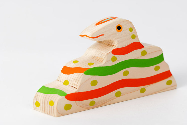 This wooden snake toy fits perfectly in hand and makes a great good luck charm for the year of the snake  or gift for the snake signs in your life. Handcrafted and painted in a simple yet modern style by folk toy studio Shinobu Kogeiten.
