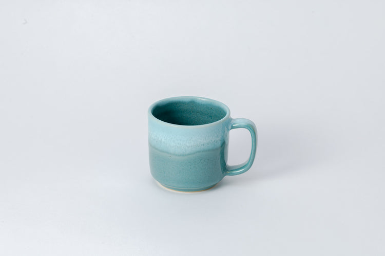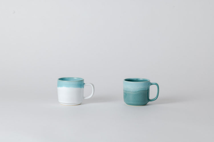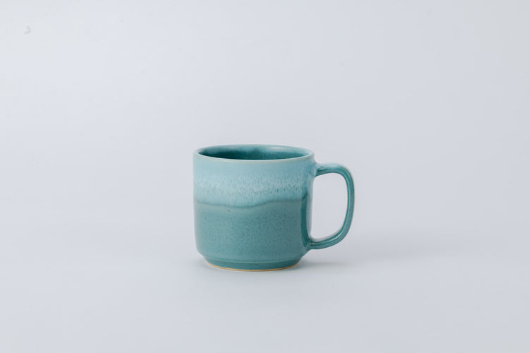 This mug is glazed with traditional green and straw white ash glazes. As each mug is handmade, the patterns on the rim are unique to each.