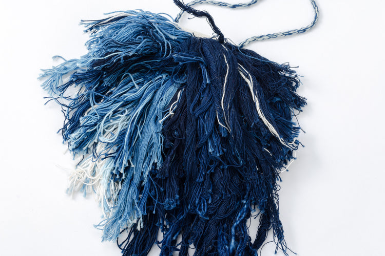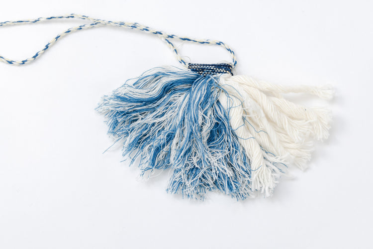 These one-of-a-kind necklaces are made using a technique called musubiori, or knotting, in which rope threads are stretched over the warp threads using a special loom, and bundles of thread are tied together. Like all our products, these pieces are completely handmade, from growing the cotton from seeds, to dyeing the threads, to weaving and finishing.