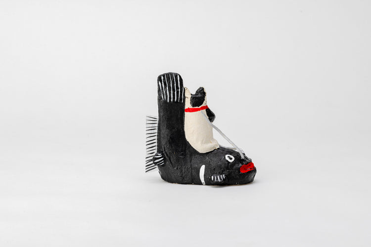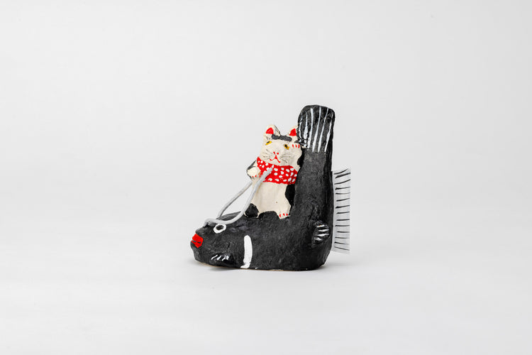 Japan's iconic maneki-neko, or beckoning lucky cat,  rides atop a catfish. Long ago, it was believed that earthquakes were caused by the movement of giant catfish, so the two are associated in Japan. This hariko symbolizes good luck triumphing over earthquake disasters and serves as a kind of prayer that they occur no more.