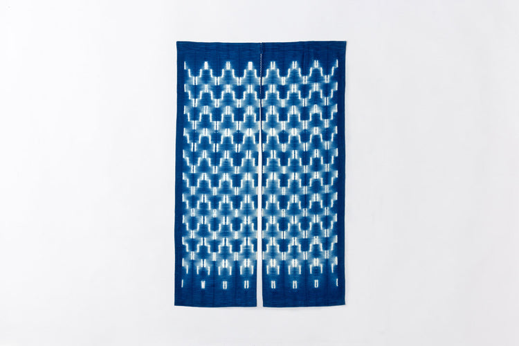 The clear indigo color of this noren (Japanese curtain) is achieved thanks to pristine water, rich forests, and home-made natural dyes made from plants nurtured from seeds. This noren is carefully crafted with shibori technique in which the cloth is folded, hand-stitched, tightly drawn together, and dyed.