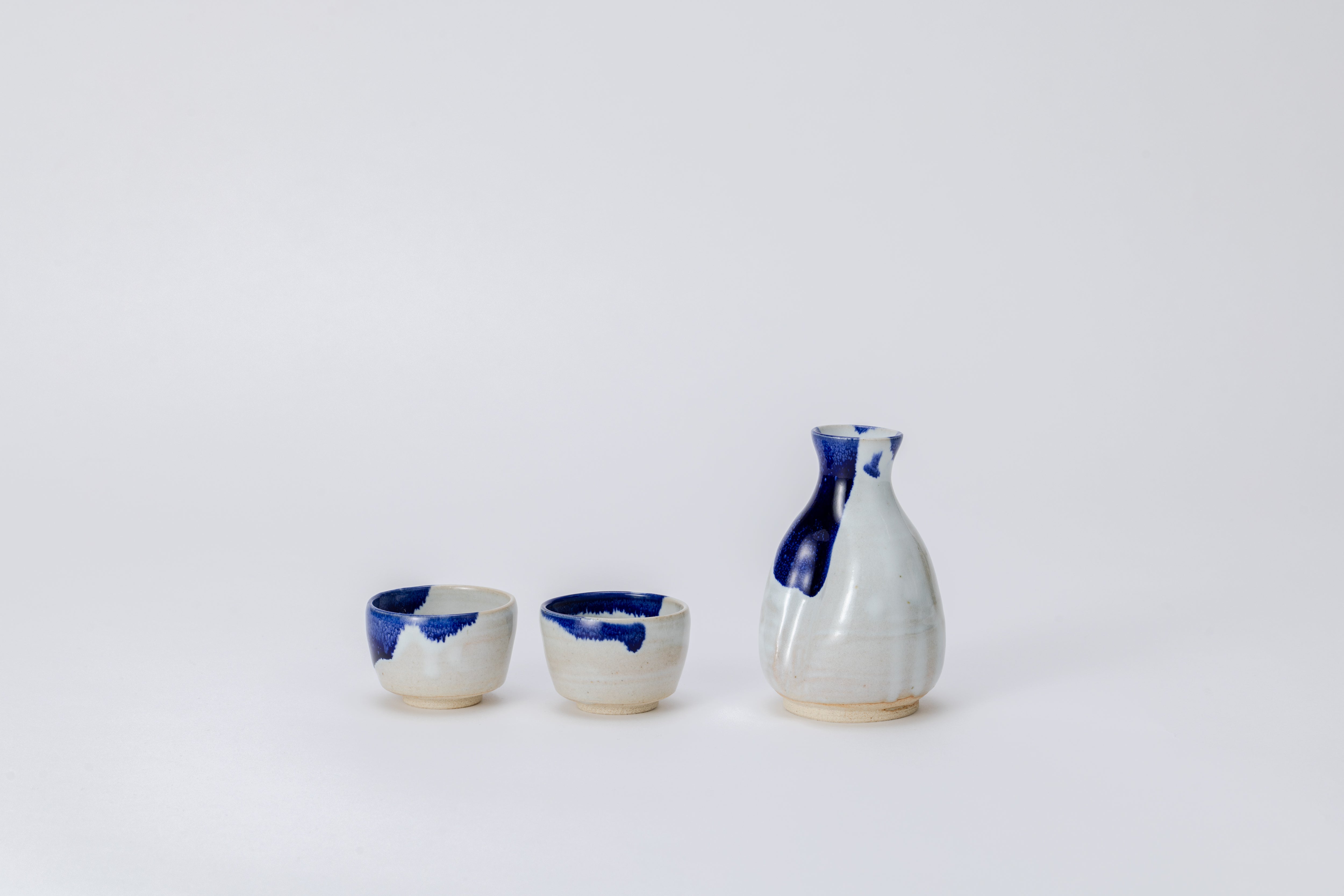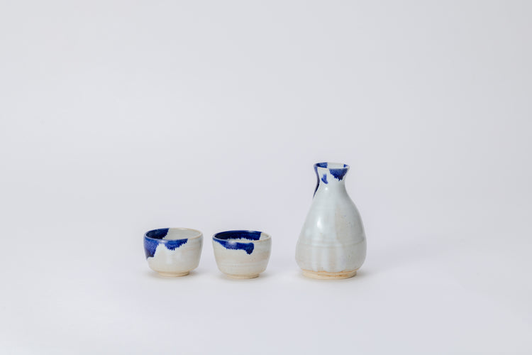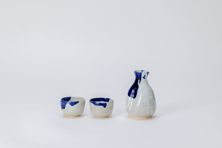 Savor a unique moment with this set of one tokkuri and two ochokos, perfect for enjoying sake on chilly nights. The dribbling technique used in creating the set adds rhythmic hues to the surface, reminiscent of the cool ambiance of a night sky, inviting you to indulge in its serene atmosphere.