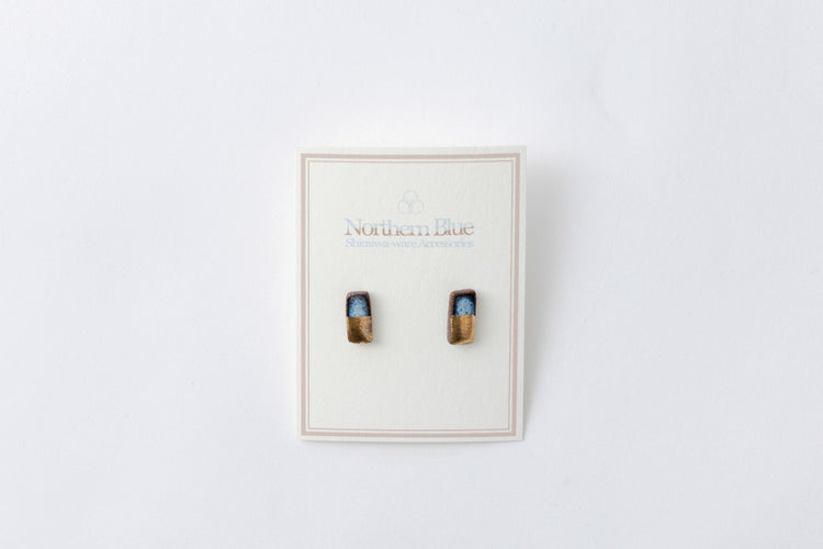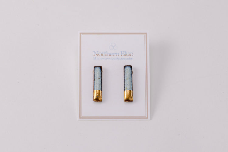 A light, comfortable, and versatile pair of earrings made from traditional Shiraiwa-yaki pottery. A lustrous blue glaze is reministcent of the long-awaited spring thaw in Akita Prefecture, the home of this pottery tradition. Gold gilt adds a touch of luxury and transitions easily from daytime to evening