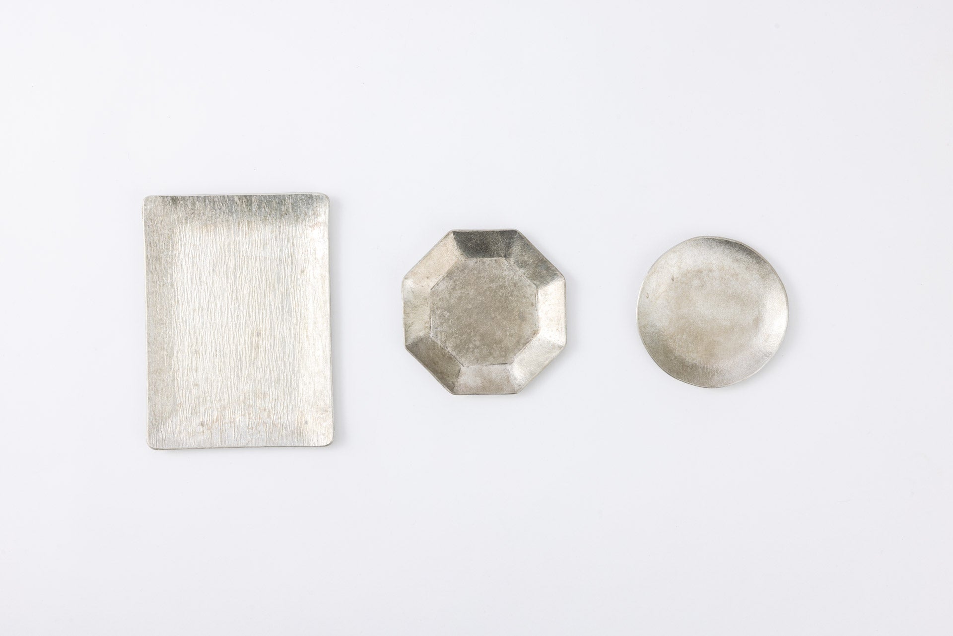 Morishita’s tinware is cast with washi paper attached to the inside of the castings before the tin is poured. The metallic surface of the tin takes on the organic texture of the washi, and unique patterns emerge. Finally, the tin is acid-washed to create a matte finish.
