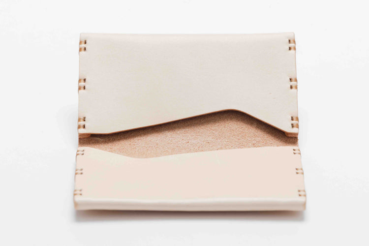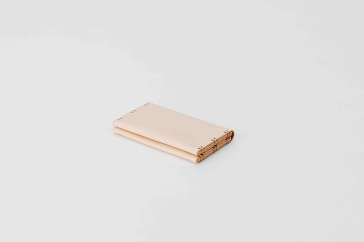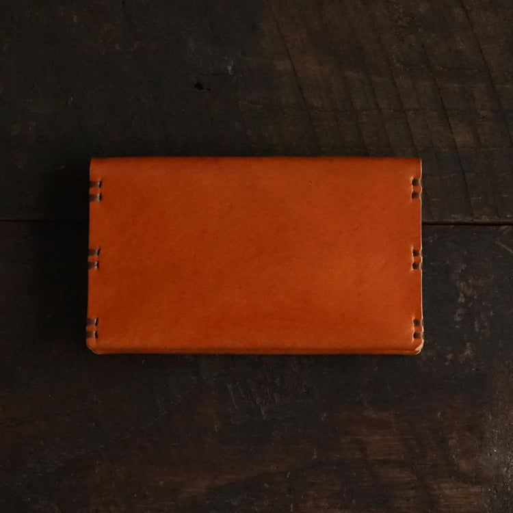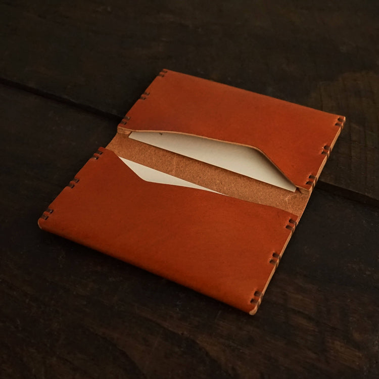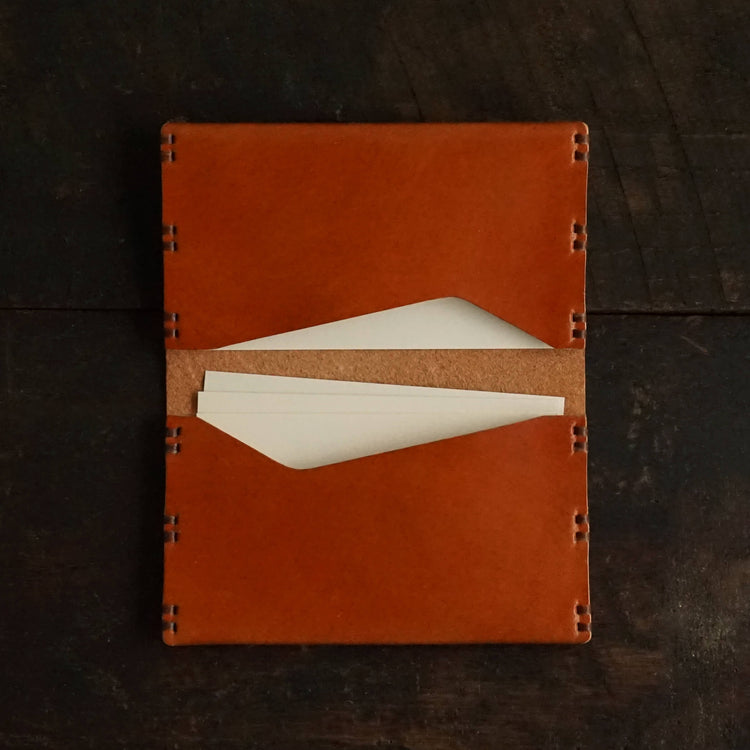 This slim bifold card holder features pockets on both sides, holding around 15 business cards or 5 standard cards. A built-in spacer allows for smooth access. The veg-tan leather develops a deep, rich patina over time, enhanced by the natural oils from your hands. The kakishibu (persimmon tannin)-dyed version, known as the "dye of the sun," gains even more depth with use, offering insect repellent, anti-fungal, and water-resistant properties.