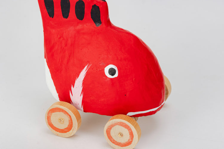 This seam bream, tai in Japanese, rolls on wheels! Tai is often eaten on special occasions in Japan and has a strong association with celebrations and festivities. Red is a lucky color and is thought to ward off misfortune. This specific rendition of Tai Kuruma is one of many others that Sawafuji-san has taken from classic drawings of Edo period toys.
