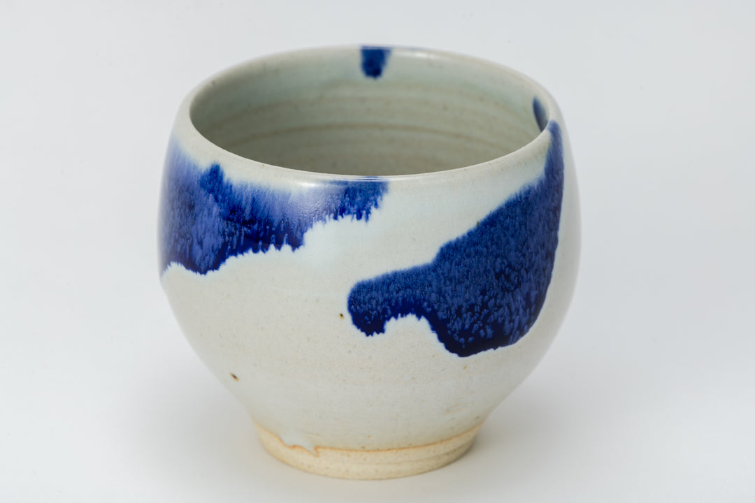 The freecup exhibits the unique design and exceptional artistry of Ando Yuri, a fifth-generation craftsman of Hoshoujiyaki Shokagama. Its azure color is achieved through the drizzling technique, and the glaze's brightness varies depending on the base shade. The cup is perfect for drinks and also works well for serving small appetizers.