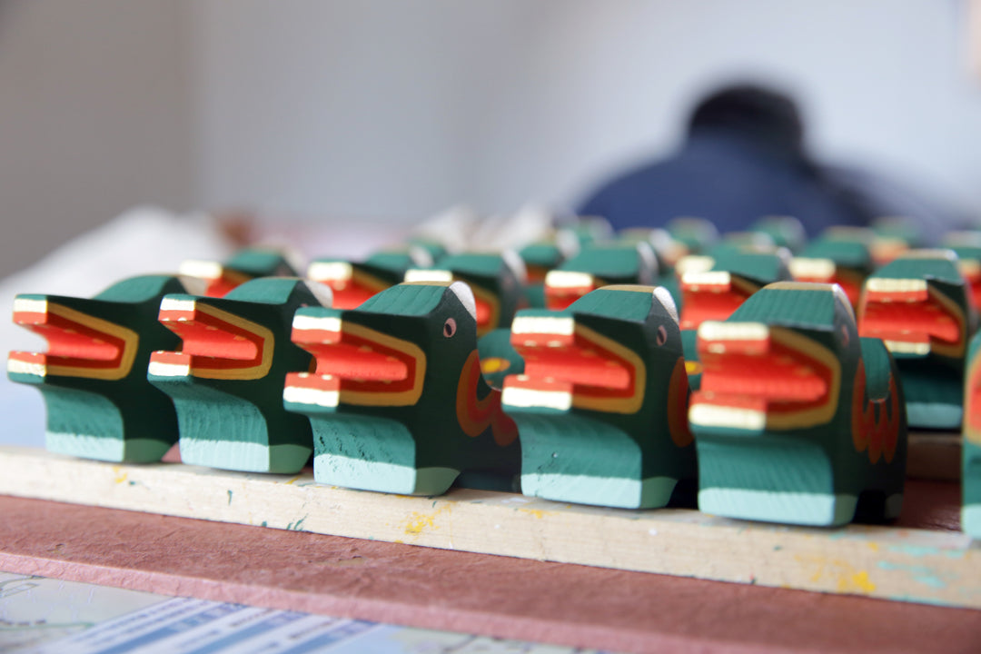 Shinobu Kogeiten was founded in 1946 by Noriyasu Shinobu, who came from a long line of carpentry joiners, and applied his skills to wooden crafts and folk toys. His son, Kentaro, now runs the studio, incorporating the traditions of his father with modern painting techniques to produce charming, handmade, regional folk toys.