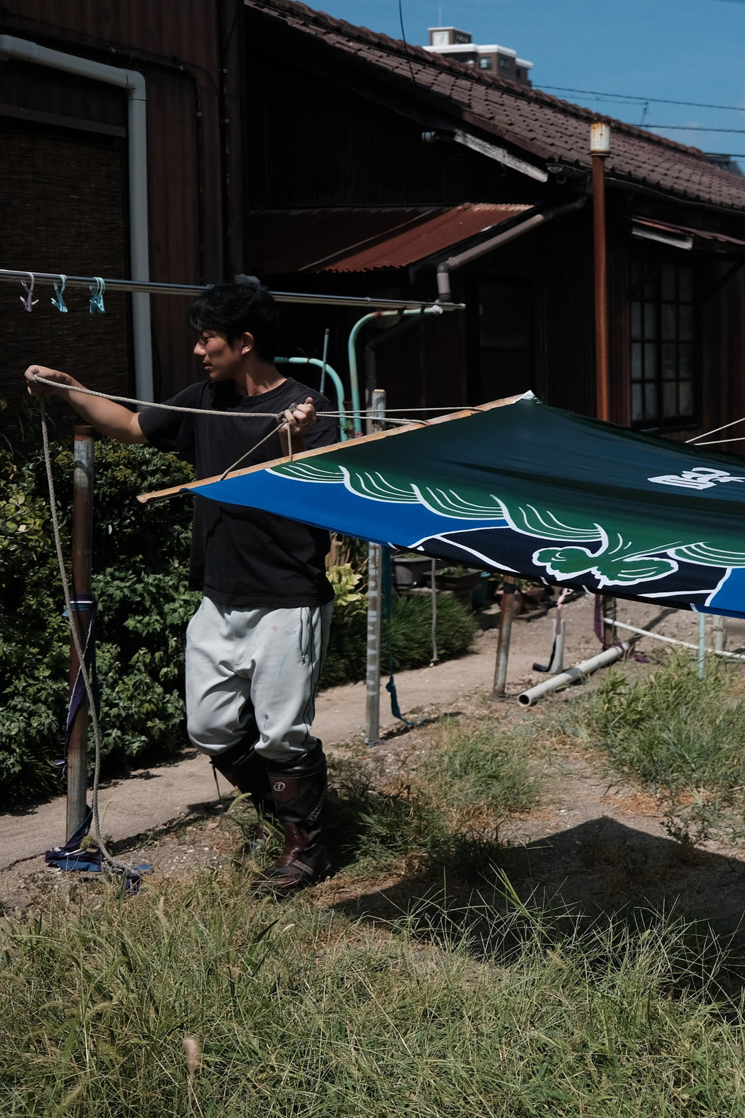 Today, in addition to producing tairyo-bata, they also create everyday items such as tote bags, table runners, and tenugui fabrics, all featuring the traditional motifs that have adorned their flags for centuries. Every piece is still made entirely by hand, preserving the integrity of their craft. In recent years, the current owner, Nariki Matsuda, the 13th-generation head of the studio, has been joined by his son, Kazuki Matsuda, the would-be 14th generation, ensuring that these time-honoured traditions continue while also embracing contemporary lifestyles