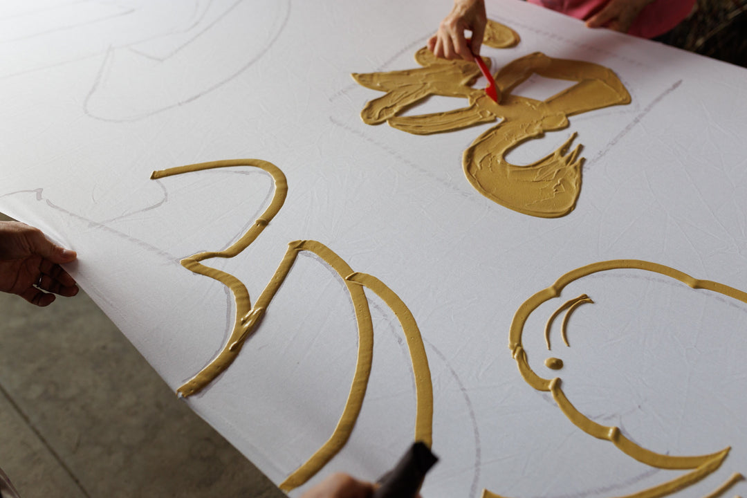 First, they are one of the few remaining practitioners of the tsutsugaki method, where designs are "hand-drawn" by piping paste to resist the dye, resulting in one-of-a-kind creations. No two pieces are ever exactly alike. While many of their works feature classic motifs, such as the auspicious sea bream, this hand-drawing technique also allows for customization—whether it’s adding names to create personalized gifts or drawing specific motifs for someone special. This flexibility has made their pieces a cherished part of the local community.