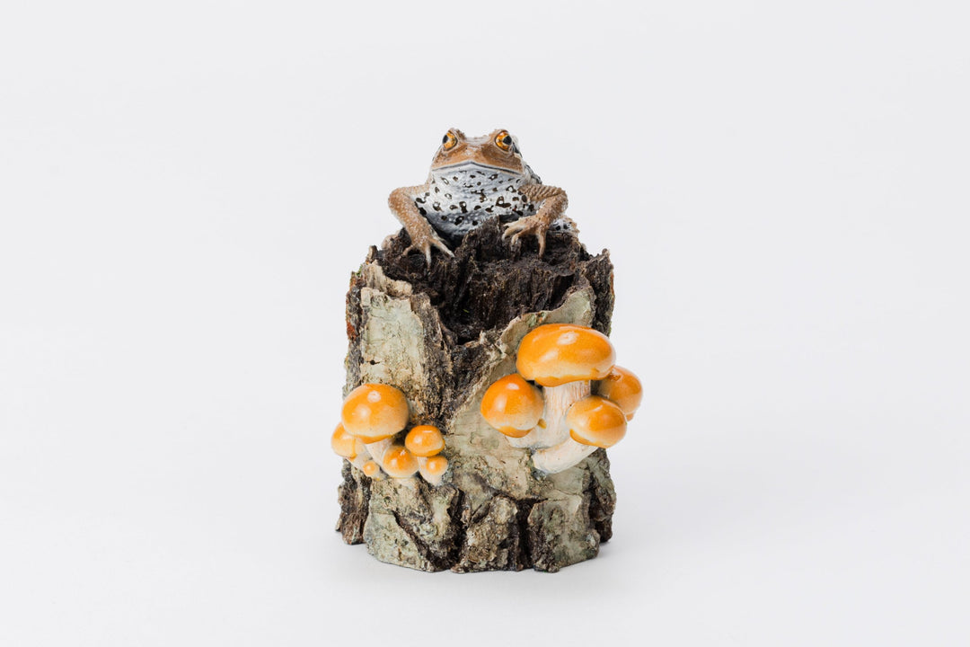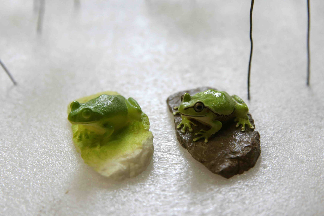The lifelike frog replicas created by Okemoto Factory are born at the foot of Mt. Daisen in Tottori Prefecture, Western Japan. Kazuo Okemoto, the master craftsman of Okemoto Factory, and Junko Mizo are skilled modeling artists who create replicas of animals and plants displayed in museums. They meticulously observe living creatures and photographs to craft detailed wax prototypes. Using silicone molds, they cast replicas and hand-paint each piece. Their work captures the realism of animals as if frozen in a moment of nature’s movement.