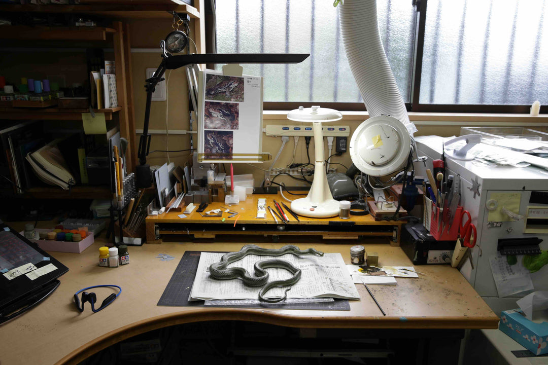 Okemoto started his career at a company in Kyoto that specialized in producing replicas. Orders from museums ranged from small creatures to dinosaur fossils and large-scale forest dioramas, allowing him to acquire techniques for reproducing various flora and fauna with incredible detail. About 25 years ago, he and Mizo established their own workshop in Tottori, his hometown.