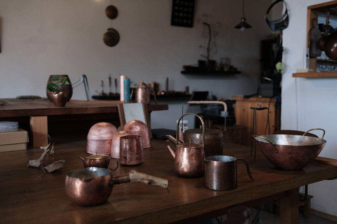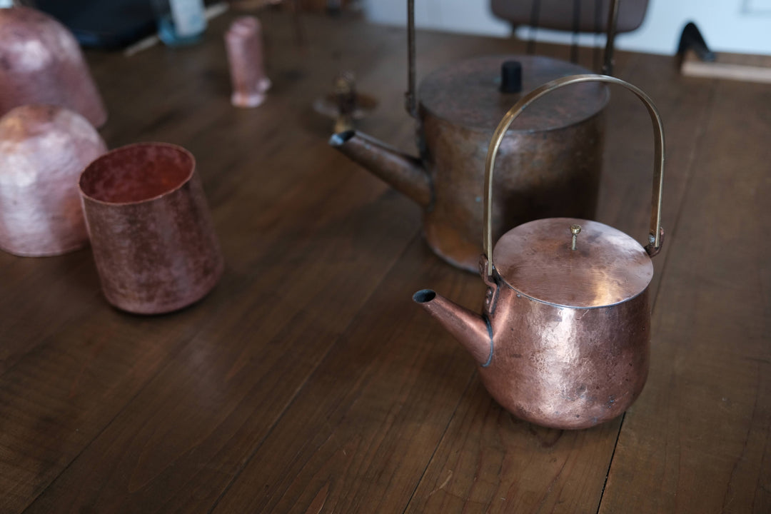 Hamachi fell in love with metalwork 40 years ago after encountering a coppersmith hammering a kettle at a street stall in Kyoto. Captivated by the motions the artisan made as they turned a sheet of metal between their legs and hammered the shape of the kettle, she said to herself then and there, “One day I will learn this technique, too.” The hammering technique that fascinated Hamachi is called shibori. By hammering, a two-dimensional sheet of metal becomes a three-dimensional object.