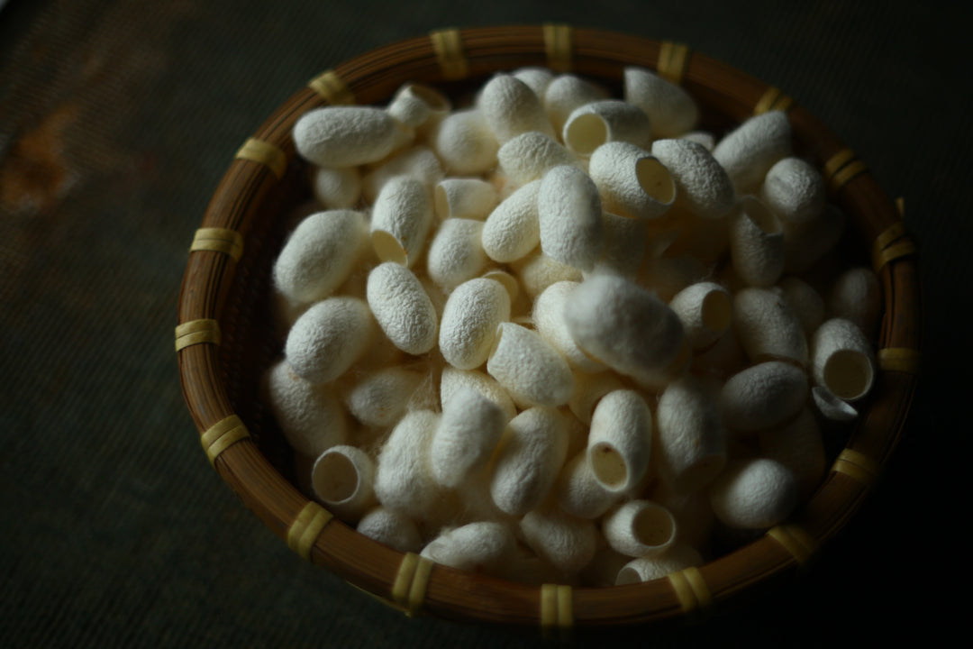 YUIKOUBOU + Yoshikatsu uses silk cocoons from regions of Miyagi where sericulture has flourished since the Edo Period. Sericulture evolved as a side-hustle for farmers in the region, who became skilled not only at raising cocoons, but also at spinning and weaving. There are more than a dozen silkworm farms in the villages along the Abukuma River which runs through Miyagi and Fukushima, where silk culture is still woven into the local identity. YUIKOUBOU is helping to contribute to and continue this culture through its various activities.